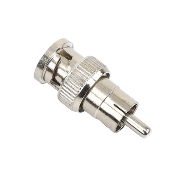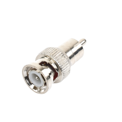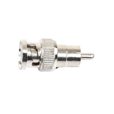 Adaptador BNC macho a RCA macho en línea, Impedancia de 75 ohm para óptima compatibilidad, Construcción en níquel, oro y PTFE, Compatible con cables RG-59 y RG-6, Dimensiones: 13.9 mm diámetro, 35 mm longitud