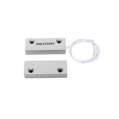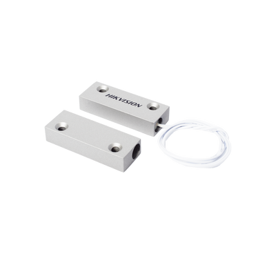 Material metálico para mayor durabilidad, Gap de 3.5 cm, precisión óptima, Diseño compacto 50x18x10 mm (maestro/esclavo), Configuración normalmente cerrada, Contacto magnético cableado Hikvision